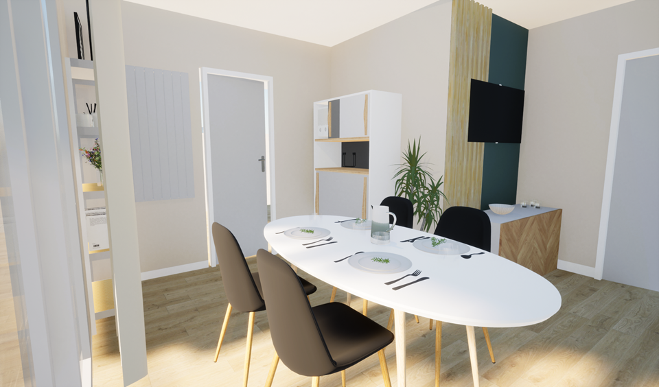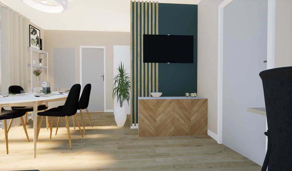 Ma cliente souhaitait un style contemporain dans les tons majoritairement verts pour les deux pièces.